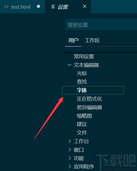 4.打开软件的设置界面之后,在用户设置模块,打开文本编辑器选项,在他的下方可以看到有字体这个选项,接着点击进去。