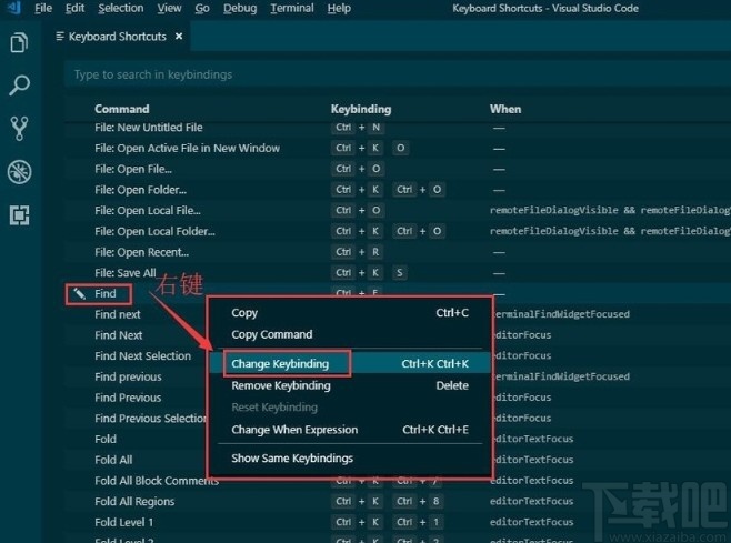 3.当我们想要更改某一个命令的快捷键时,使用鼠标右键点击该命令选项,在出现的选项列表中点击change keybinding之后进行更改。