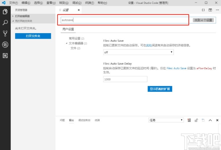 2.点击打开设置界面之后,我们在用户设置模块,搜索框中输入autosave这个选项之后们就会显示相关的信息设置。