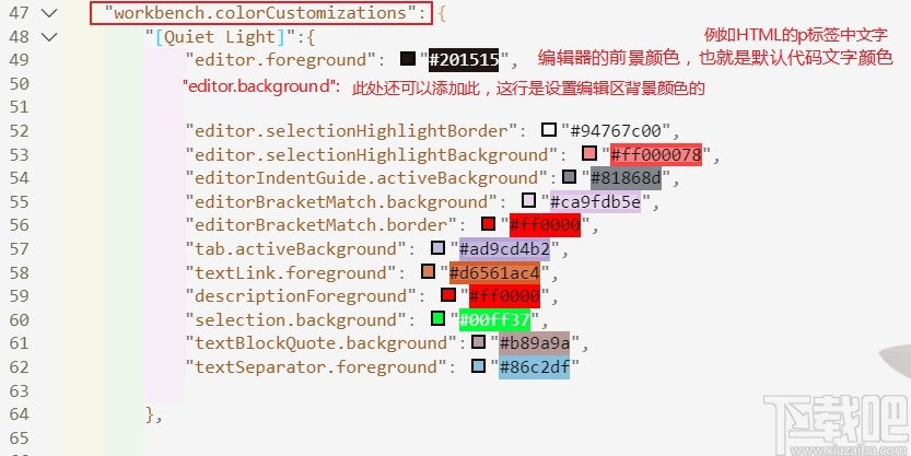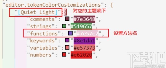 5.接下来在settings.json文件中添加json代码准备设置颜色即可,每一个代码右边有颜色标注,大家可以根据自己的需求来选择自己想要使用的颜色。