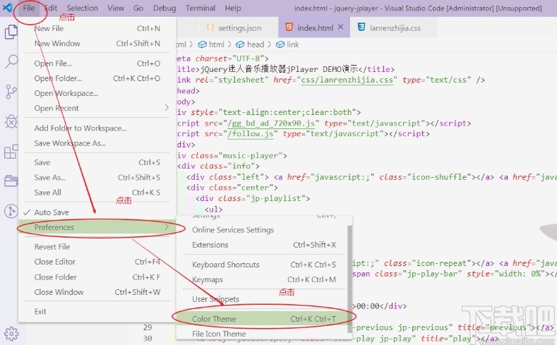 1.首先第一步我们可以先改变一下软件的主题,点击左上角的文件选项之后,选择Preferences这个选项,选择它下面的Color Theme这个选项。