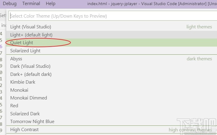 2.选择之后,在出现的界面中,我们选择主题,在打开的下拉列表中选择Quiet Light这个主题即可。