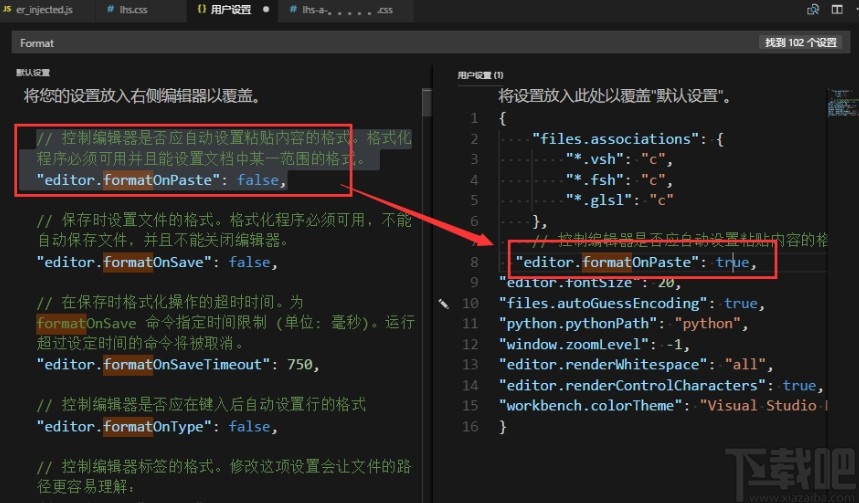 3.打开软件的这个设置界面之后,我们在其中搜索format关键字,找到可以格式化的所有选项,然后将想要格式化的选项复制到右边的编辑区域进行修改即可。