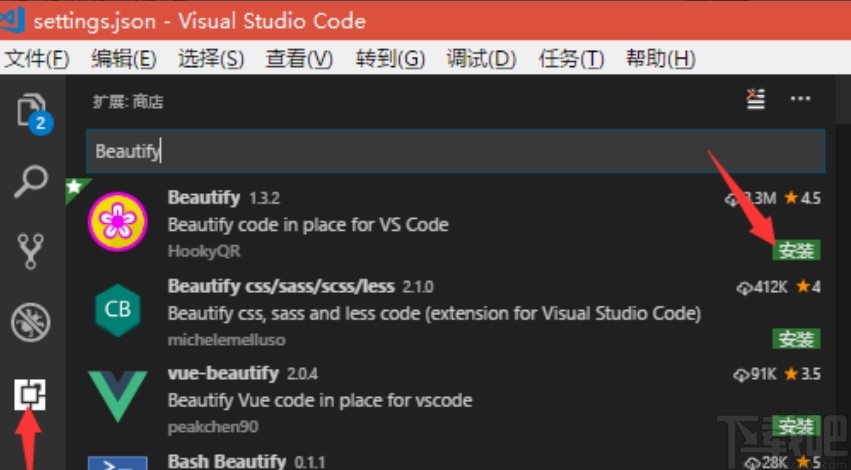 4.另外我们可以下载一个名为beautify的插件,搜索之后在搜索结果的第一个结果选项右边点击安装即可。