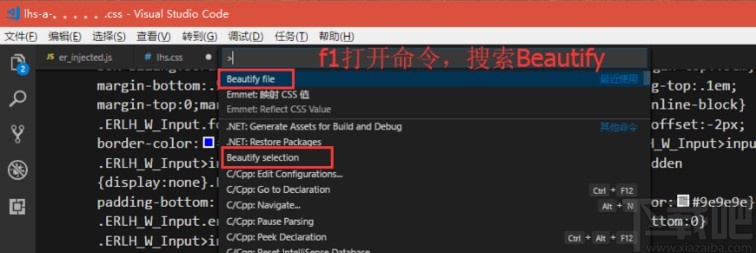5.安装好这个插件之后,重新启动电脑,按下键盘F1键打开命令界面,在其中输入beautify这个关键词,选择beautify file这个选项之后就可以格式化整个文件。