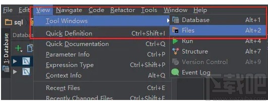 2.在出现的下拉框中选择“Tool Windows”选项;其旁边还会出现一个子下拉框,我们在子下拉框中选择“Files”,将需要运行的sql文件在软件中打开。