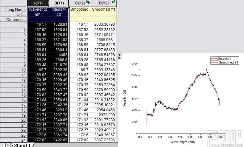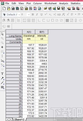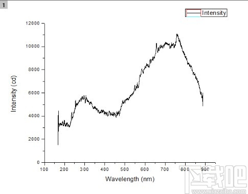 2.之后我们选中A、B两列,通过Plot-Line-/Line操作之后,得到下图所示的信息,图中显示的是光强度随着波长进行变化,并且图形线条是比较模糊的,表示有噪声。