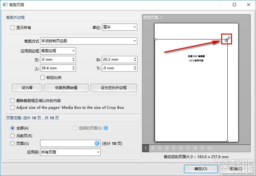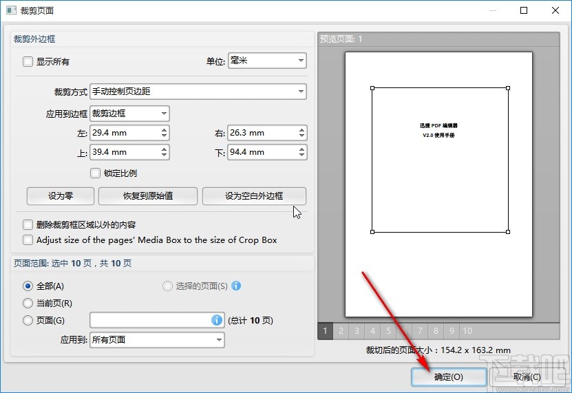 5.移动裁剪框到自己需要的合适大小之后,可以看到裁剪各边的宽度,裁剪的宽度越宽,PDF文件的大小也就越小,根据我们压缩PDF文件的需求来判断裁剪即可,最后点击确定按钮。