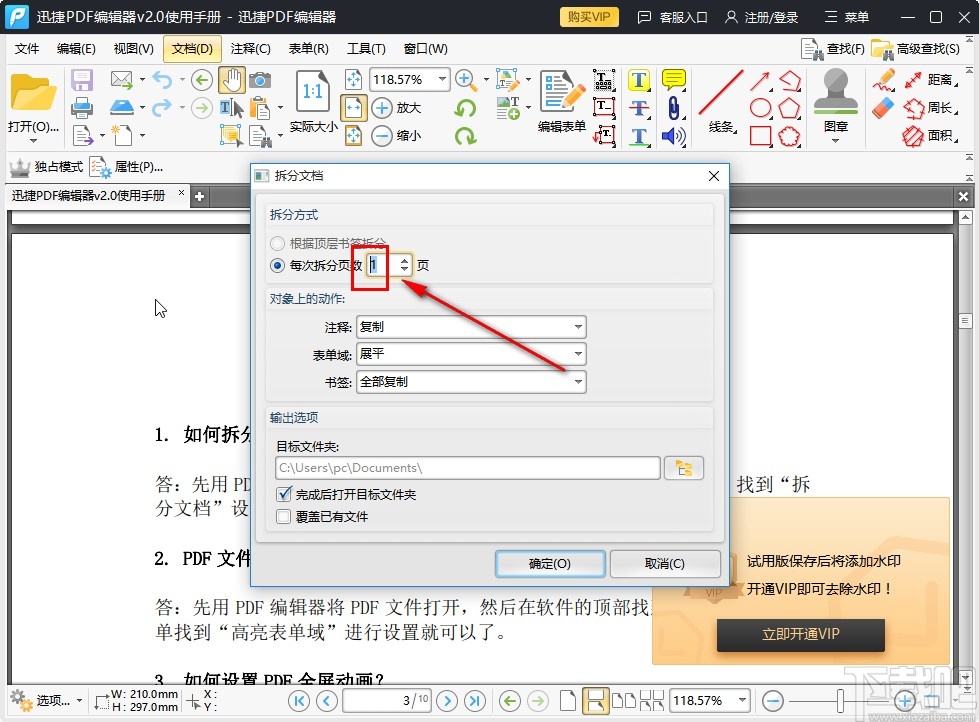 4.打开拆分文件的界面之后我们需要先设置拆分的页数,也就是将多少页文档拆分到一起,根据自己的需求选择即可。