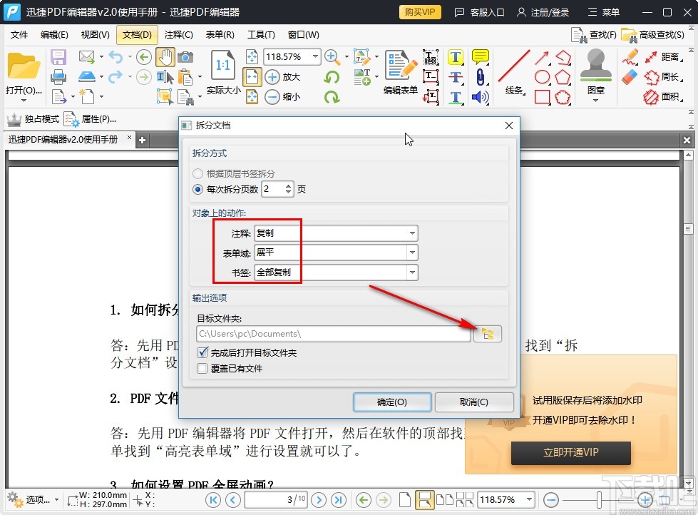 5.选择好拆分页数之后,在对象上的动作选项中根据自己的需求进行选择即可,选择之后点击目标文件夹选项右边的文件夹图标。