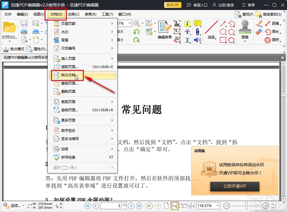 3.紧接着我们在界面上方的文档选项中,找到拆分文档这个功能选项,点击之后打开拆分文件的界面。