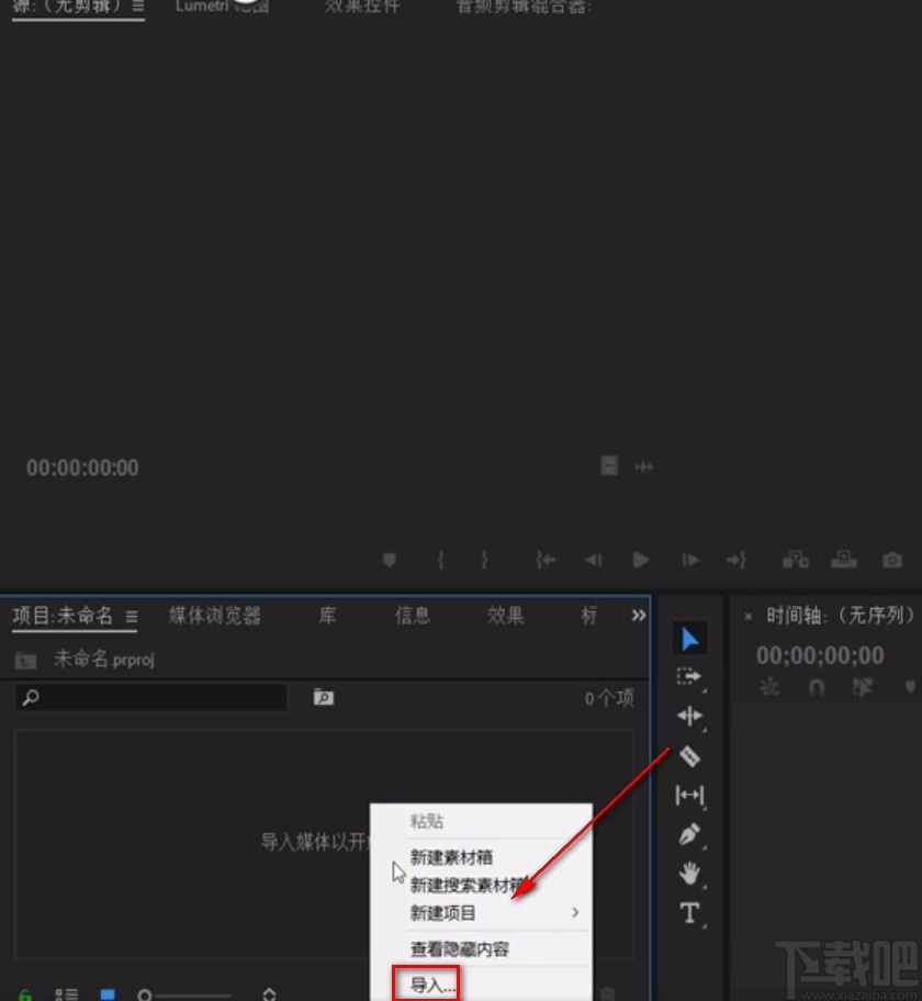 1.首先打开软件,我们在界面左下方的素材箱中右击鼠标,在出现的下拉框中选择“导入”,将需要旋转90度的视频导入软件,并将其拖拽到右下方的时间轨道上。