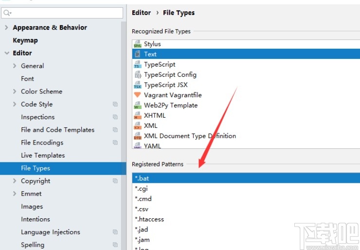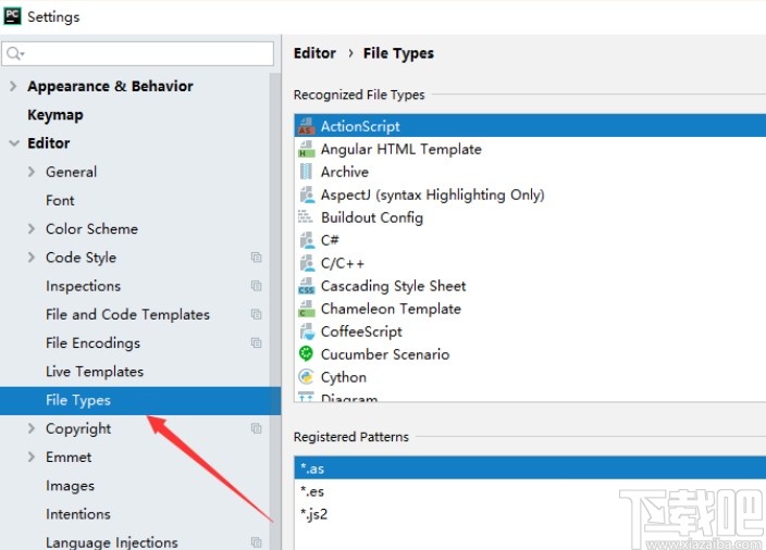 2.点击这个设置选项之后,在左边的Editor选项下方找到File Types这个文件类型选项并点击。