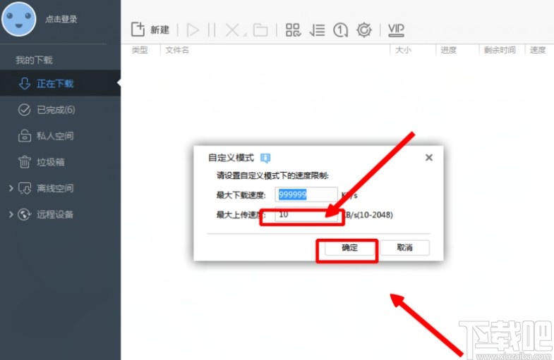 5.点击之后会直接打开自定义模式的设置界面,我们在其中就可以对最大下载速度和最大上传速度进行限制了,输入指定的大小之后点击确定按钮即可。
