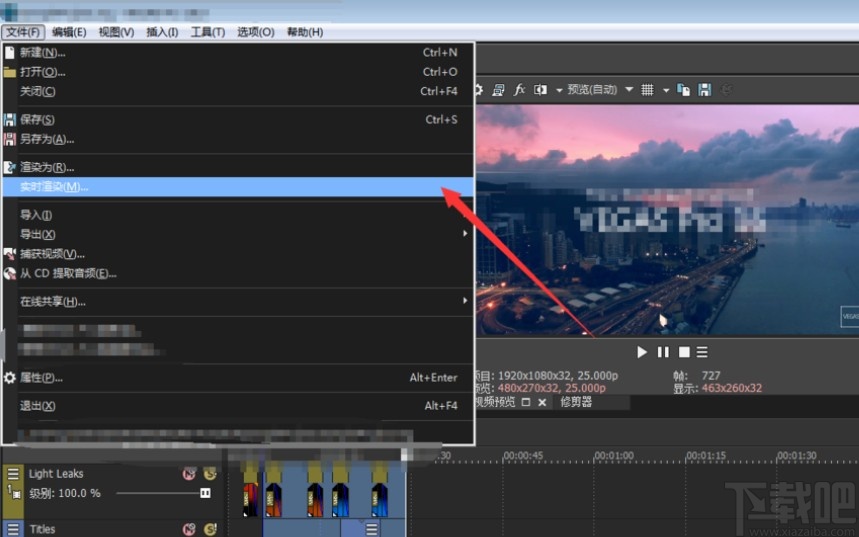 4.我们也可以点击左上角的文件选项,选择实时渲染功能进行渲染,这样渲染出来的视频是固定格式的,选择“渲染为”可以设置格式。