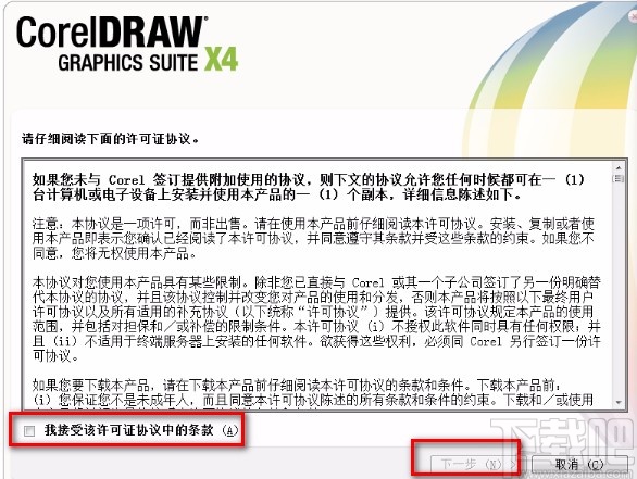 2.初始化安装向导加载完毕后,我们进入到软件安装协议页面,勾选页面左下方的“我接受该许可协议中的条款”,再点击“下一步”按钮进入到下一个页面。