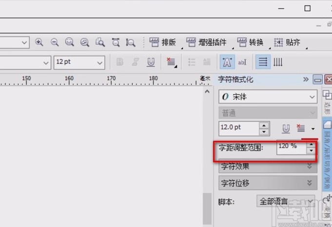 7.最后我们在界面右侧找到字符格式化窗口,在窗口中找到“字距调整范围”选项,我们点击该选项后面的上下按钮就可以调整字间距了。