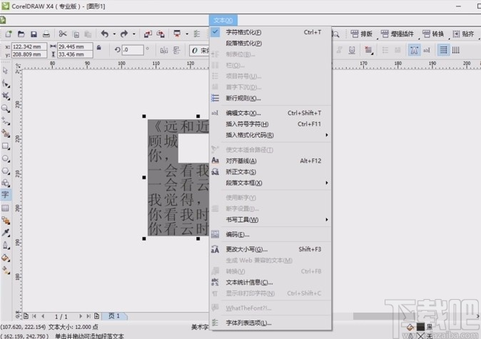 6.之后在界面上方点击“文本”选项,我们在出现的下拉框中选择“字符格式化”选项,打开字符格式化窗口。