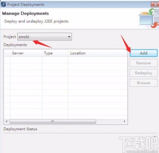 2.接着在Project Deployment窗口中找到“Project”选项,点击该选项后面的下拉框,并根据自己的需要在下拉框中选择需要发布的web项目,再点击“Add”按钮。