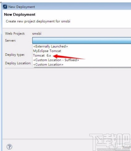 3.然后进入到New Deployment页面,我们在页面中找到“Server”选项,点击该选项后面的下拉框,在下拉框中找到tomcat服务器,再点击页面底部的“Finish”按钮,并点击Project Deployment窗口底部的“OK”按钮完成web项目的发布。
