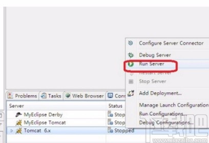 5.随后我们在界面下方就可以找到Tomcat 6.x选项,用鼠标右击该选项,在出现的下拉框中选择“Run Server”就可以启动tomcat了。