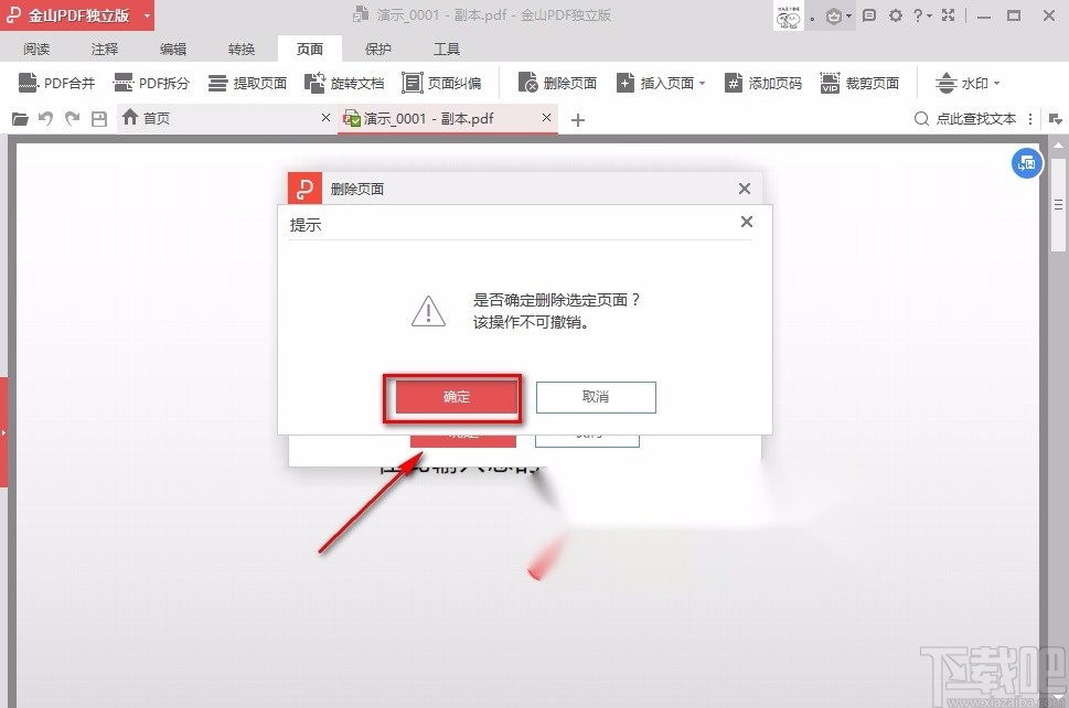 6.最后界面上会出现一个提示框,框中提示我们是否确定删除页面,我们点击“确定”按钮就可以成功删除页面了。