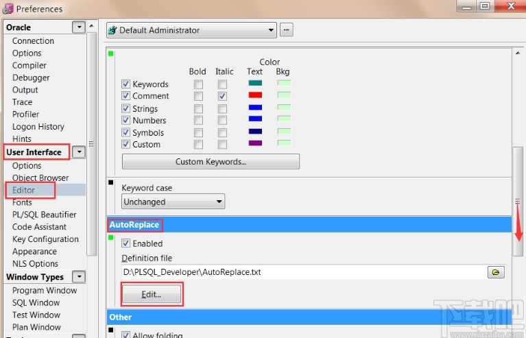 2.点击打开首选项界面之后,在左边的user interface用户界面功能区中,找到Editor选项点击之后,在右边界面找到AutoReplace自动替换选项,之后点击其中的Edit按钮。