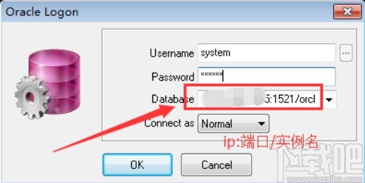 4.我们重启软件的时候在登录界面,需要设置Database输入指定的数据IP端口或者实例名称,输入之后点击OK按钮进行登录。