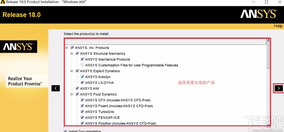 5.在安装产品选择页面中,我们根据自己的需要勾选要安装的产品,再点击页面右侧的箭头符号进入到准备安装页面。