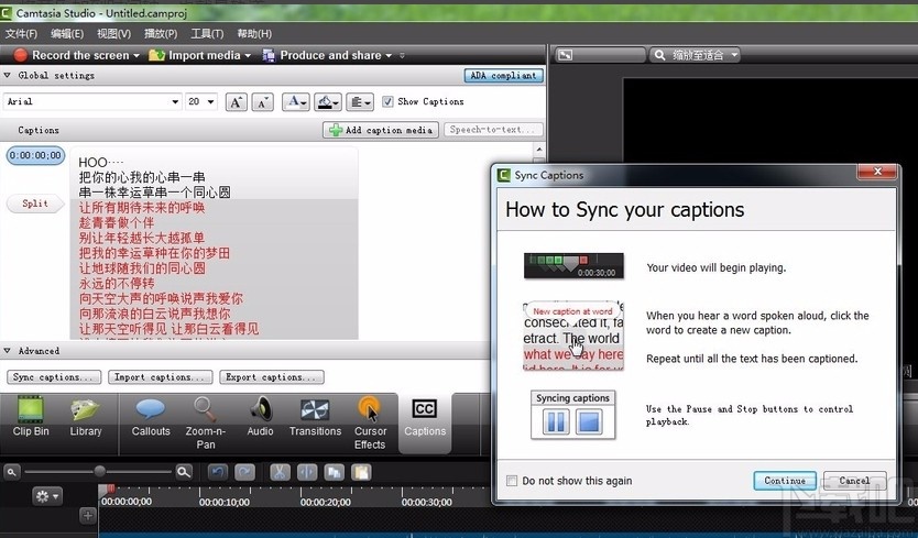 5.紧接着我们在回到字幕,在时间轴上方找到“Syncing Captions”按钮,界面上会出现一个对话框。
