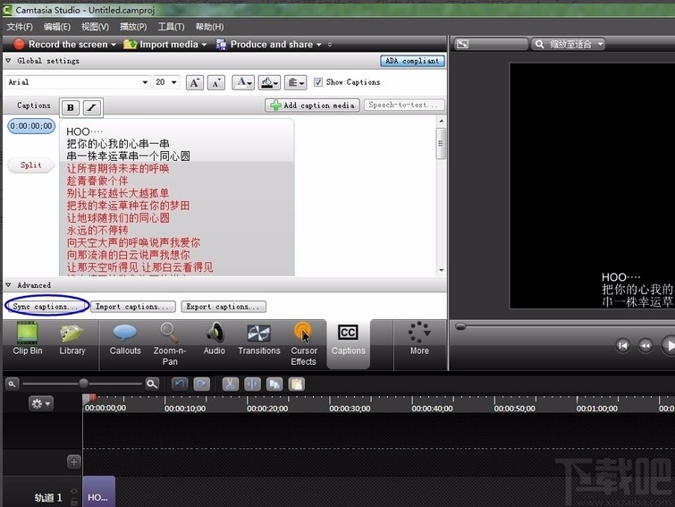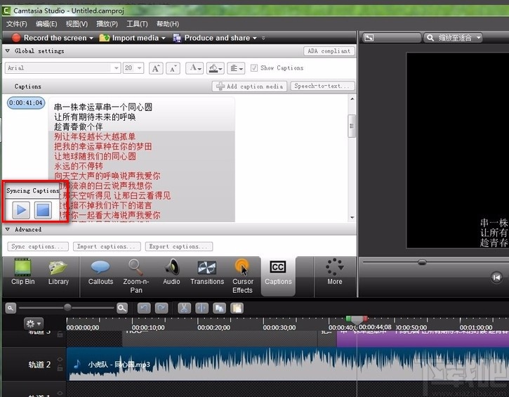 2.接着在界面左侧找到“Sync captions”按钮,就可以按照听到的节奏,自定义字幕与音乐同步。
