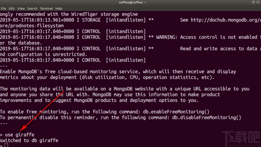 1.首先第一步,我们需要先输入代码use +数据库名称,先创建出一个数据库再进行下一步的操作。