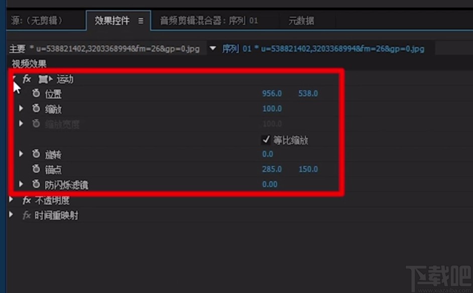 6.这样就可以成功的给视频添加上图片了;最后我们选中图片文件,再点击界面左上方的“效果控件”选项,就可以在该选项下方对图片的位置、缩放以及旋转等进行设置了。
