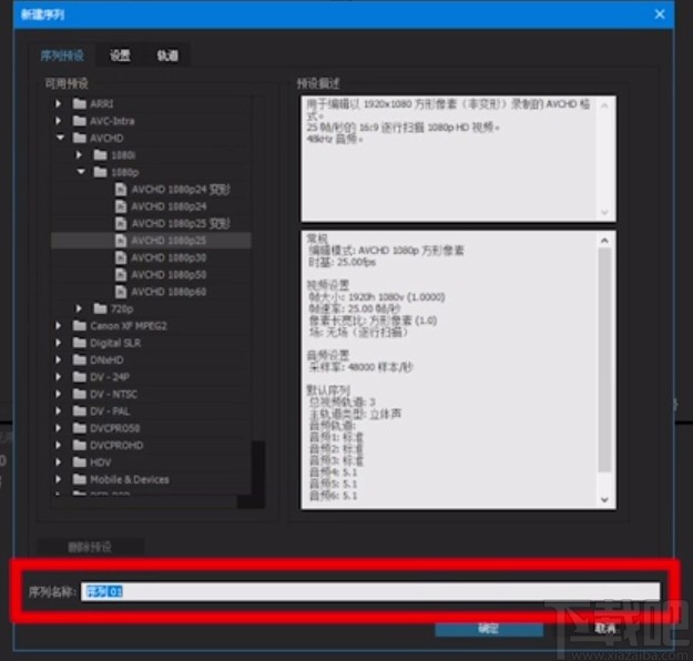3.然后界面上就会弹出一个新建序列窗口,我们在窗口中设置序列的预设信息和名称等参数,再点击窗口底部的“确定”按钮即可。