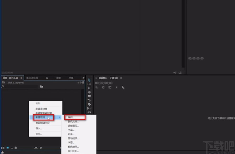 2.我们在弹出的下拉框中选择“新建项目”选项,其旁边会出现一个子下拉框,我们在子下拉框中选择“序列”选项。