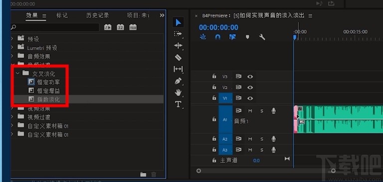 6.另一种方法是在界面左上方点击“效果”选项,在选项下方选择“交叉淡化”选项下方的三个选项,都可以实现声音淡入淡出的目的。