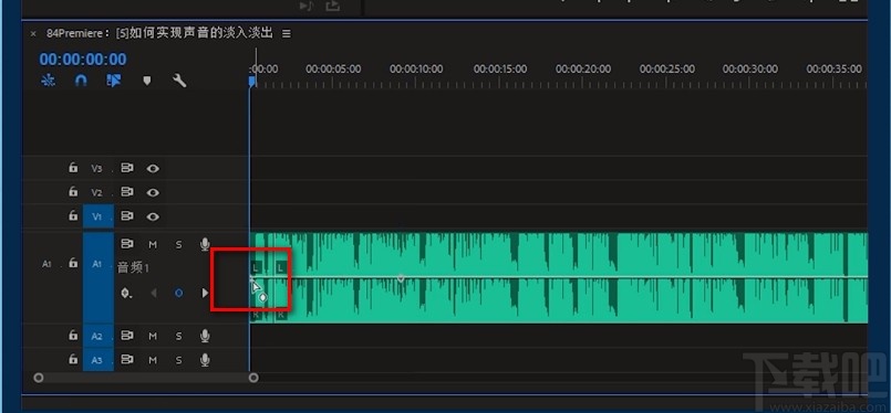 2.接着在时间轴上选中声音素材,添加音频关键点的标识就会自动启用,在声音的出点位置,点击图中红色方框圈起来的标识点,就为声音添加了一个关键点。