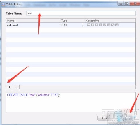 6.我们在窗口顶部找到“Table Name”选项,在该选项后面的文本框中输入表名称,再点击窗口左下方的加号图标按钮添加列,然后点击窗口右下角的“Create”按钮就可以成功创建数据库了。