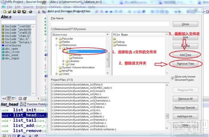 3.接着我们点击软件界面上方的Project选项,选择其中的add and remove project files,打开这个界面之后,选择包含想要添加类型文件的文件夹,将这个文件夹删除之后,再点击添加按钮重新选择添加。