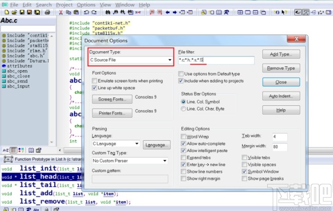 2.紧接着在Document Type选项中,点击下拉列表选择C Source File这个选项,在右边的文件选项中设置文件格式,如下图中所示。