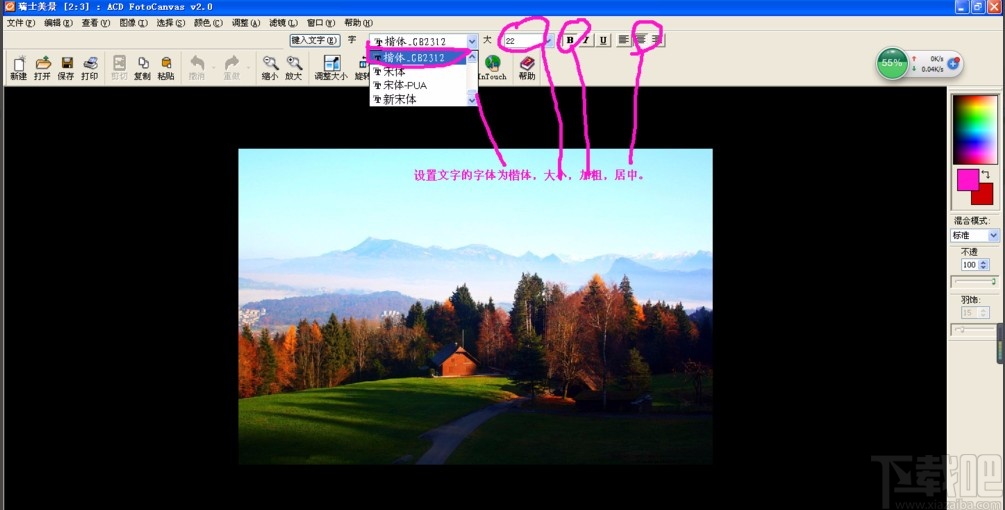 3.然后根据自己的需要,我们在界面上方设置文字的字体、大小、是否加粗等参数。