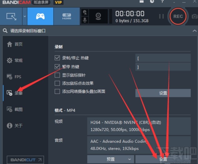 1.首先第一步我们打开软件之后在界面左边找到录像这个选项,找到之后点击切换到其中,在右边界面下方点击设置按钮。