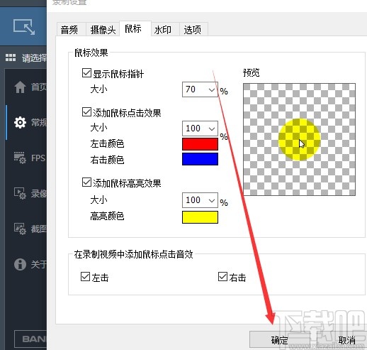 5.勾选添加鼠标高亮效果之后根据自己的需求来设置鼠标效果和颜色,在右边预览界面可以预览到鼠标设置之后的效果,满意之后点击确定按钮保存即可。