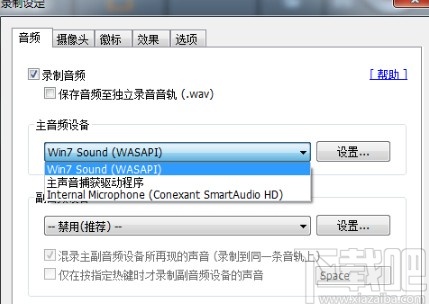 4.点击进入到录制音频的界面之后,在上方先选择录制音频这个选项,勾选之后点击打开主音频设备这个模块的下拉列表,选择想要录制的主音频设备,选择电脑音频选项即可,如下图中的Win7 Sound (WASAPI)。