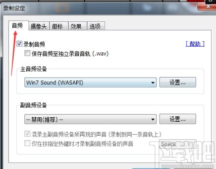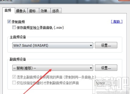 5.选择电脑声音为录制主音频之后,在下方的副音频设备中,将音频设备的选项选择为禁用,这样就只会录制电脑的声音了。