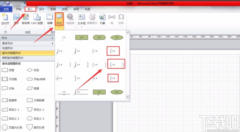 2.接着我们在插入选项下方找到“标注”选项,点击该选项会出现一个下拉框,在下拉框中找到大括号标注并点击。
