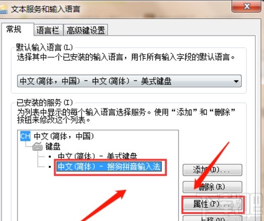2.点击这个设置选项之后,我们会看到出现的文本服务和输入语言界面,在这个界面中,我们选中搜狗输入法之后,点击属性按钮。
