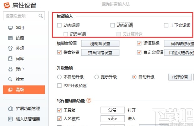 5.取消勾选这个选项之后,我们就可以看到在智能输入模块中所有的选项都被取消勾选了,我们将记录新词的功能也取消勾选即可,这样输入法就不会自动记忆词组了。