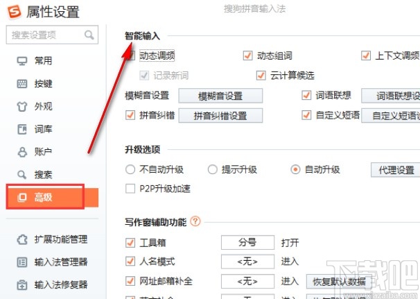 4.点击切换到这个高级设置界面之后,找到右边界面的智能输入选项模块,将其中的动态调频功能取消勾选。