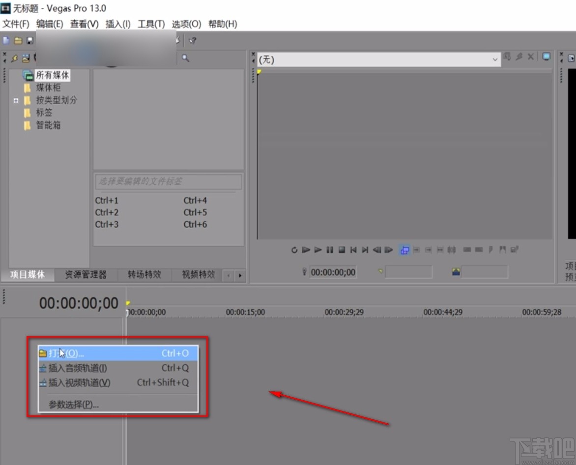 1.首先打开软件,我们在软件界面的左侧找到“项目媒体”选项,在该选项下方右击鼠标,并在出现的下拉框中选择“打开”选项。